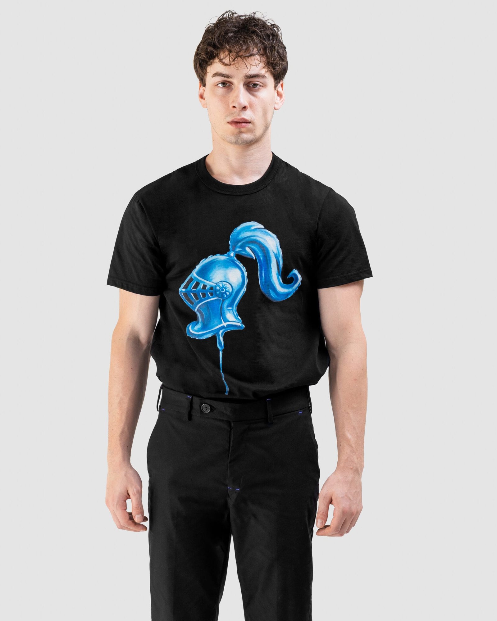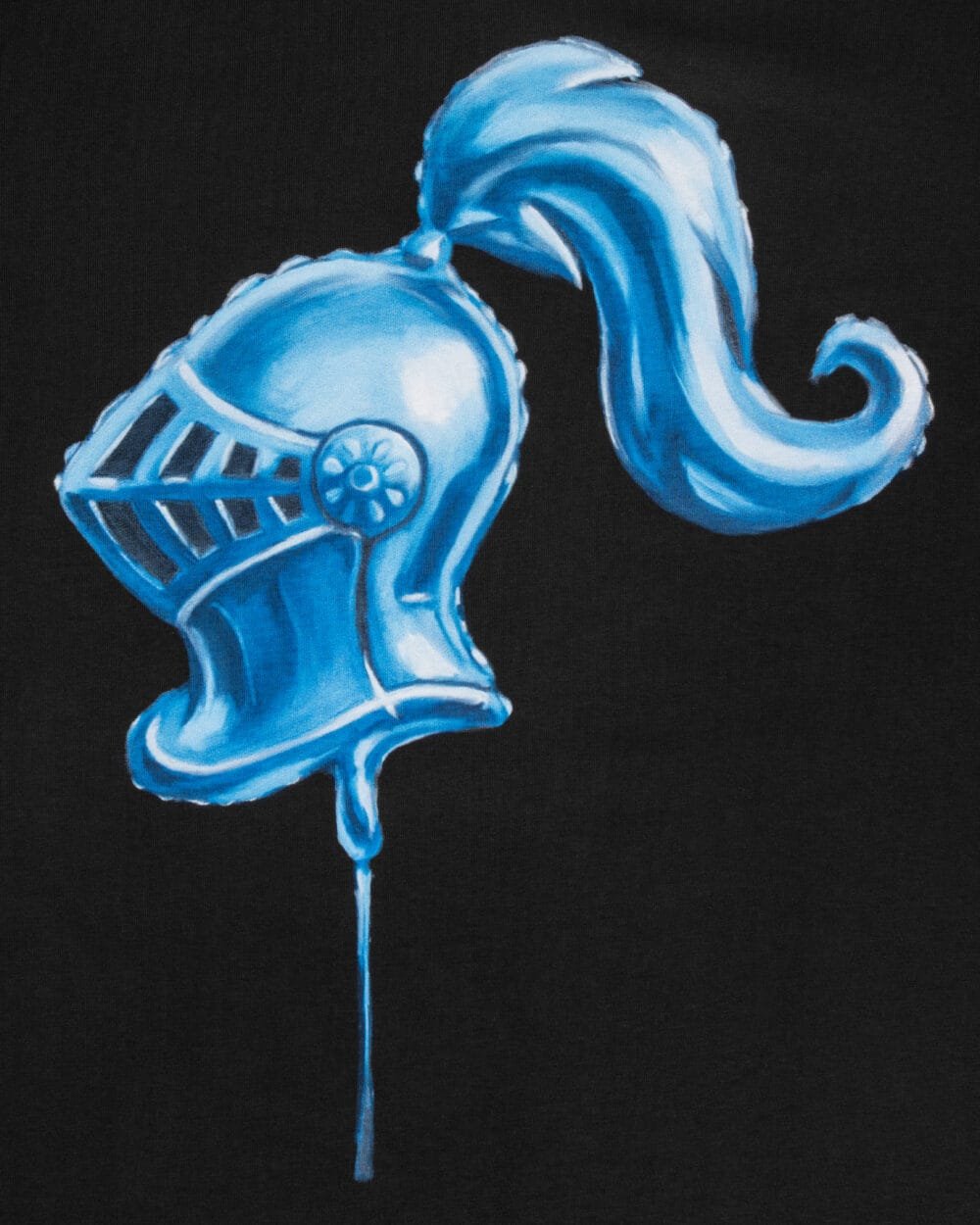 Blau begins in black, a quiet depth where form is allowed to drift. At the front, the soldier’s helmet softens, melting into a balloon like blue, as if discipline itself has learned how to float. What was once rigid now breathes, suspended between weight and wonder. Signed at the back in calm typography.
